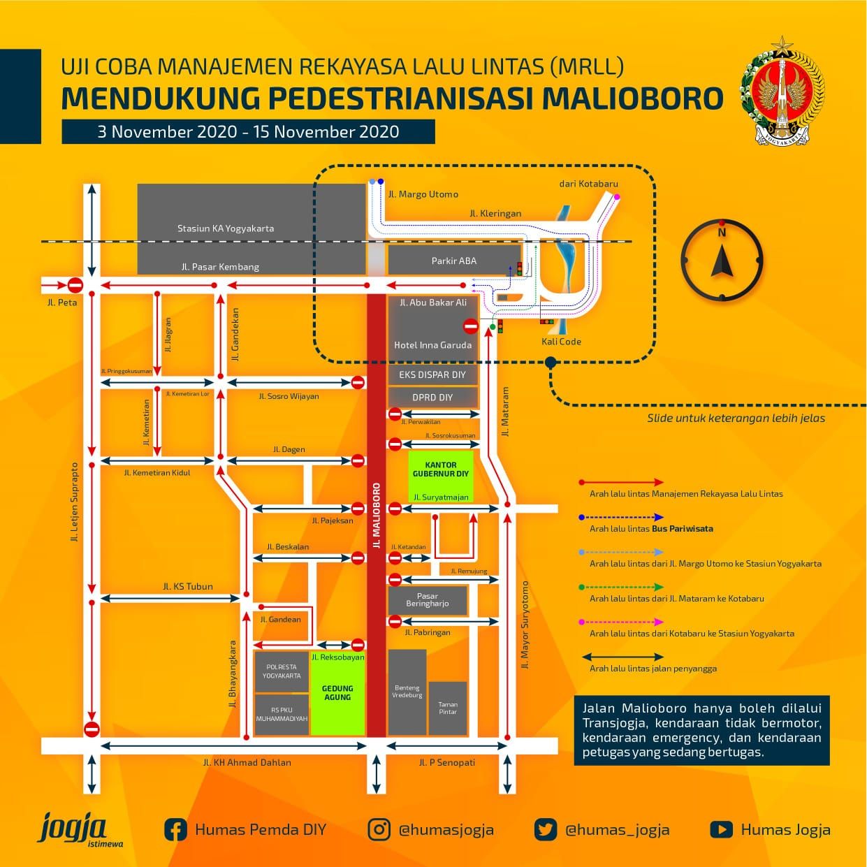 “Dari Simpang Gramedia nantinya kendaraan diizinkan mengarah ke timur melewati depan RS Bethesda. Akses menuju Malioboro diarahkan melalui Flyover Lempuyangan, lalu masuk ke Jalan Mataram,” jelasnya.