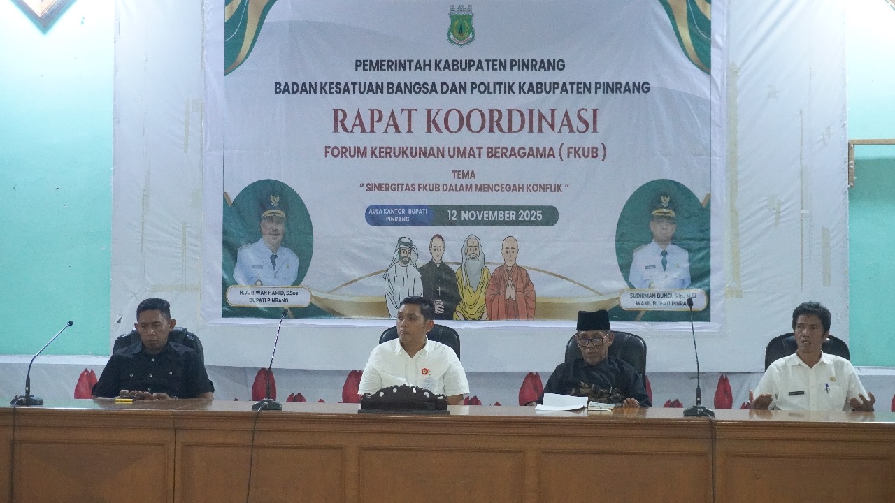 Pinrang, Lokal Jawa – Pemerintah Kabupaten (Pemkab) Pinrang terus memperkuat komitmen dalam menjaga kerukunan dan toleransi antarumat beragama. Hal itu diwujudkan melalui penyelenggaraan Rapat Koordinasi Forum Kerukunan Umat Beragama (FKUB) yang digelar di Ruang Pola Kantor Bupati Pinrang, Rabu (12/11/2025).