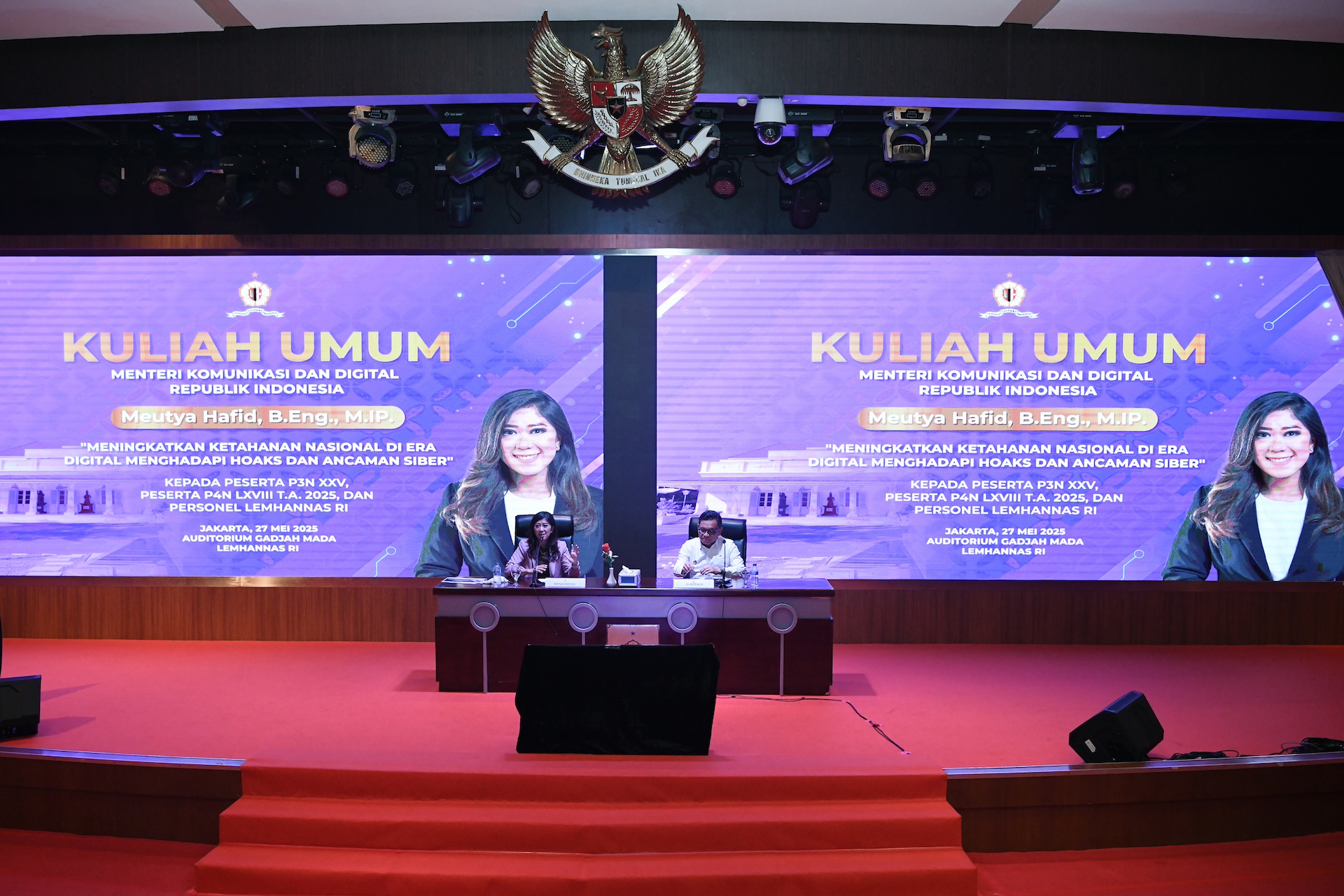 Meutya juga mengupas ancaman siber yang datang dalam wujud informasi menyesatkan. Ia memaparkan tiga bentuk hoaks yang kini menjadi senjata ampuh dalam merusak tatanan sosial: