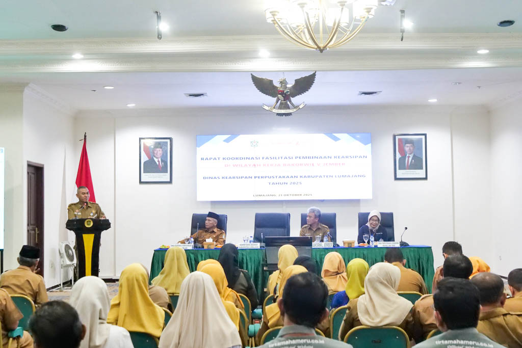 Lokaljawa, Lumajang – Pengelolaan arsip yang tertib dan sistematis menjadi pilar penting bagi pemerintahan yang transparan dan akuntabel. Hal ini ditegaskan Sekretaris Daerah Kabupaten Lumajang, Agus Triyono, saat membuka Rapat Koordinasi Fasilitasi Pembinaan Kearsipan di wilayah kerja Bakorwil V Jember, yang digelar di Ruang Nararya Kirana, Kantor Bupati Lumajang, Selasa (21/10/2025).